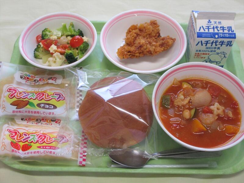 バターロール ロックチキン クリスマスサラダ クリスマススープ(ミネストローネ) セレクトデザート(チョコクレープ・いちごクレープ) 牛乳 |