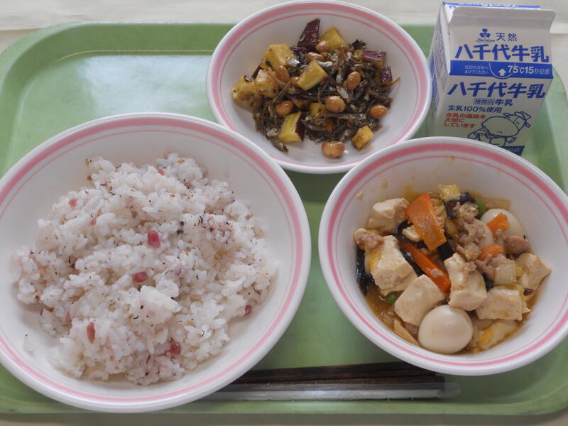 ごはん イカのごまがらめ 家常豆腐 牛乳 |