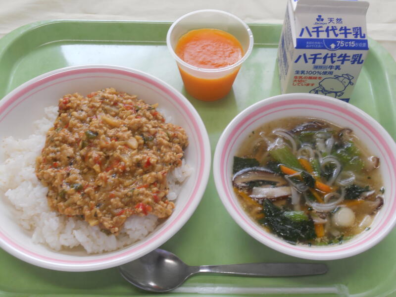 アマランサスごはん 麻婆なす丼(具) めか玉スープ 巨峰 牛乳 |