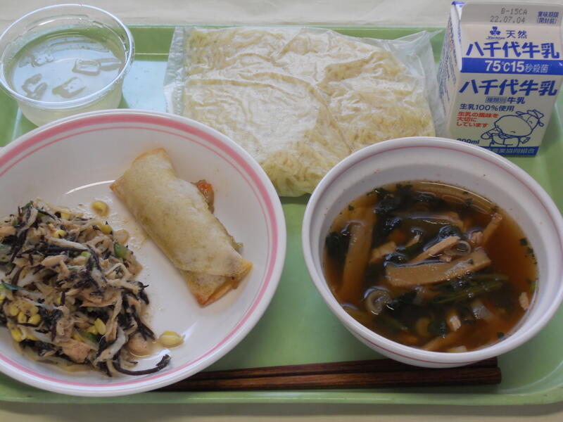 ソース焼きそば ひじき春巻き ブロッコリーのスープ いちごヨーグルト(既製品) 牛乳 |