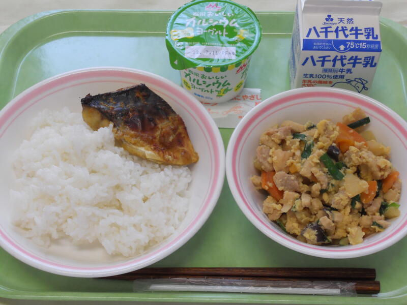 ごはん 鯖のみそ煮 新じゃがのそぼろ煮 ヨーグルト(既製品) 牛乳 |