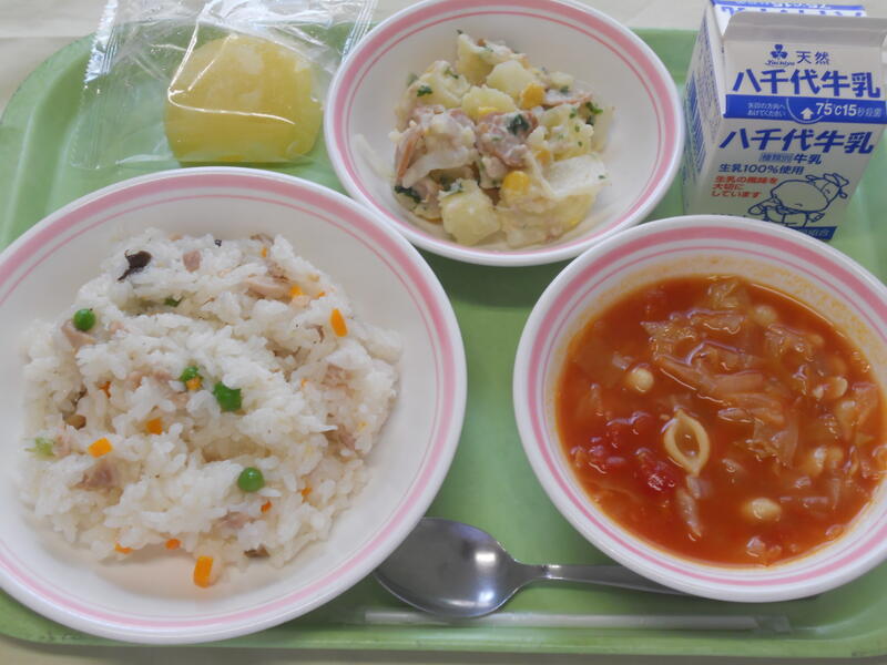 挽肉オムレツはケチャップがかかっており、みんなにとっても食べやすい一品だったと思います。 パスタサラダは、コーン、きゅうり、わかめ等多くの具材が入っていて、栄養満点でした。 じゃが芋と玉ねぎのみそ汁は、新じゃがの味を十分に楽しむことができました。 ご馳走様でした。 |