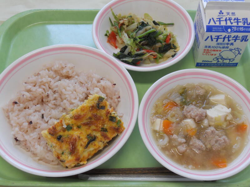 たこめし 切干大根の卵焼き 肉団子スープ おかか和え 牛乳 |