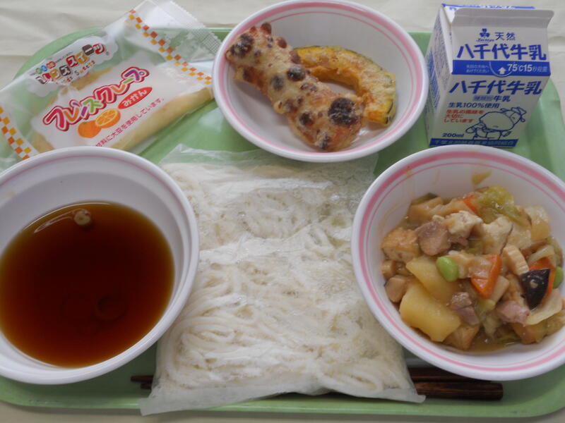 ぶっかけうどん 天ぷら(ちくわ、南瓜) 生揚げと野菜のうま煮 みかんクレープ(既製品) 牛乳 |