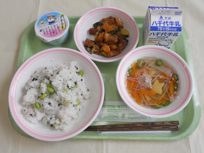 枝豆ごはん 鶏肉と夏野菜の甘酢ソース 七夕汁 あまのかわゼリー 牛乳 |