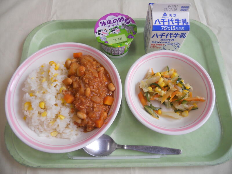 | コメント | 中学部が一生懸命皮むきしたとうもろこしは色も味も濃く、夏を感じる一品でした。チリコンカンの味付けもちょうどよく、具材も食べやすい大きさにカットされていてとてもおいしかったです。サラダにもとうもろこしが入っていてさっぱりした味にとうもろこしの食感がとてもよかったです。すべておいしくいただきました。ごちそうさまでした。 |