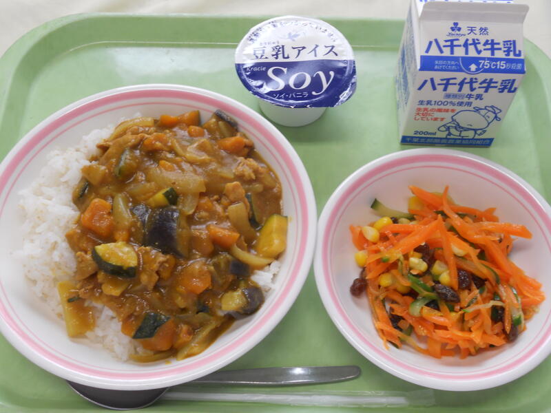夏野菜カレーは、かぼちゃ、なす、トマト、ズッキーニが食べやすい大きさに切られており、カレールーとよく合い、季節を感じながらいただきました。 またマーマレードキャロットラペは、人参、きゅうり、とうもろこし、干しぶどうが入り、さわやかな酸味が食欲をわかしてくれました。 今日のように蒸し暑い日、豆乳アイスはうれしい一品でした。 おいしく安全な給食、一学期間ありがとうございました。 |