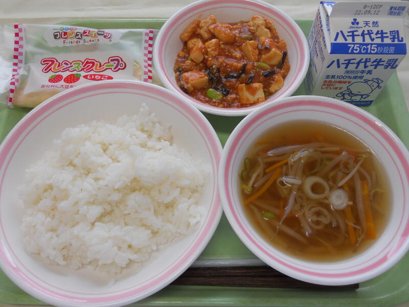 ごはん えびと豆腐のチリソース もやし中華風スープ いちごクレープ(既製品) 牛乳 |
