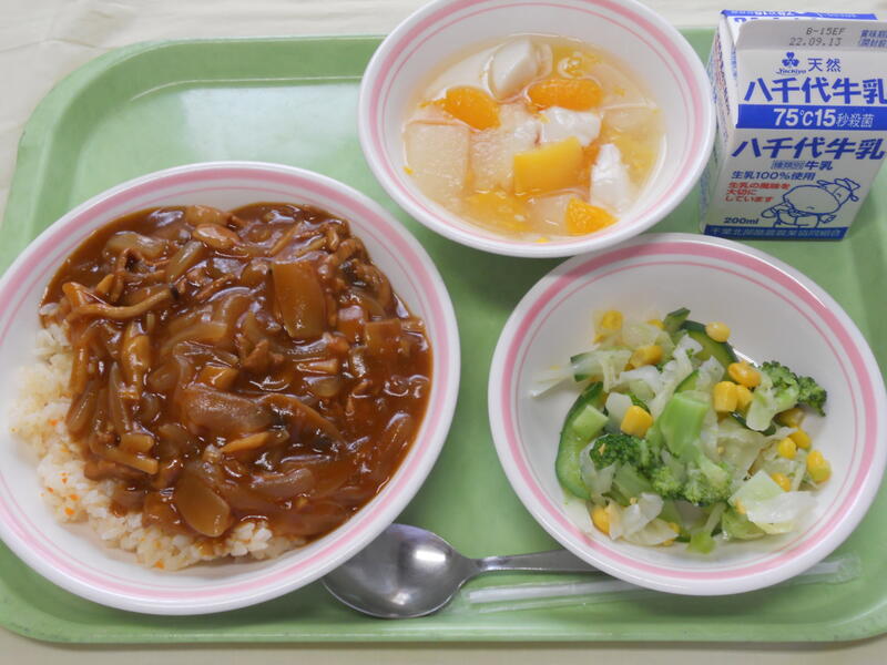 アマランサスごはん 大豆入りキーマカレー イタリアンサラダ (フルーツヨーグルト)→フルーツ和えに変更 牛乳 |