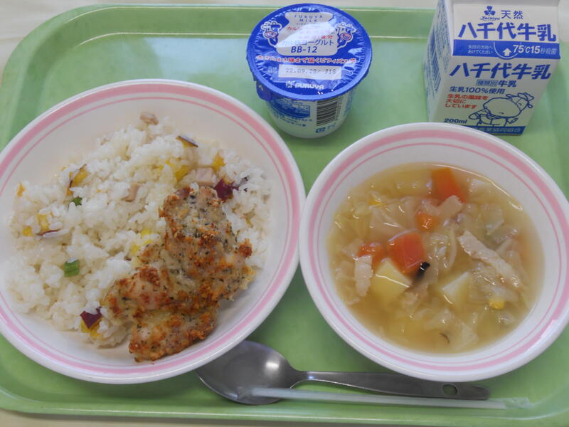 さつまいもとハムのピラフ 鶏肉のパン粉焼き キャベツスープ ヨーグルト(既製品) 牛乳 |