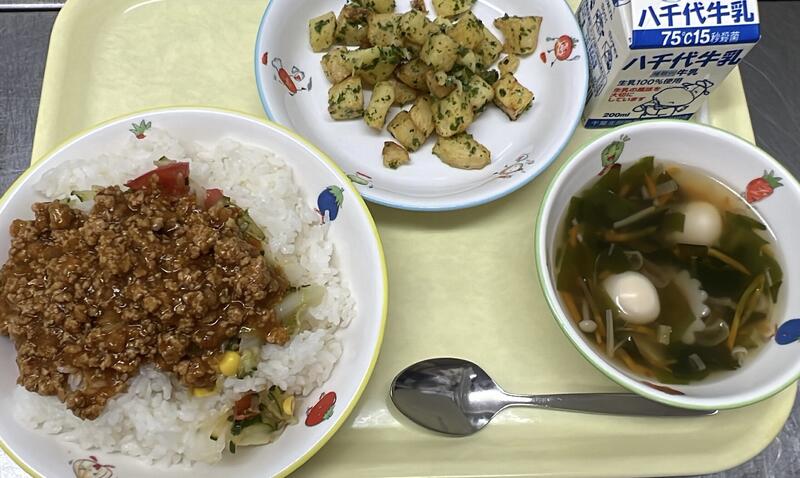 タコライス あおのりポテト うずらたまごとわかめのスープ 牛乳 |