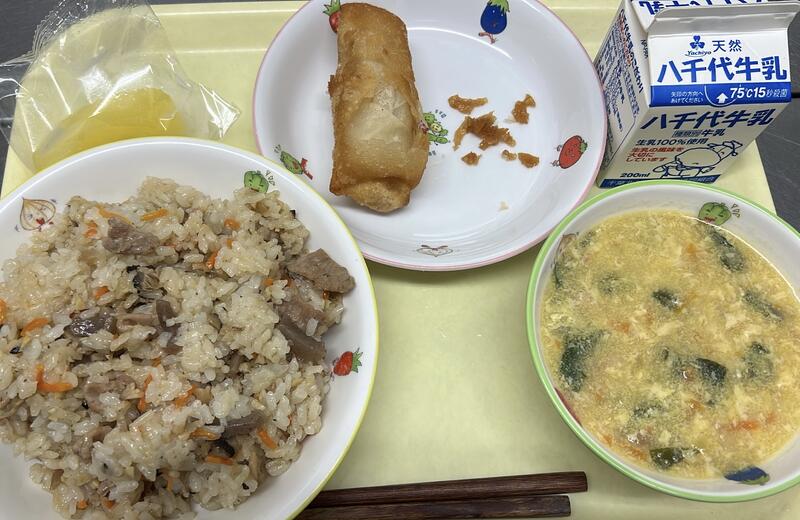 ちゅうかおこわ ポテトはるまき ちゅうかコーンたまごスープ れいとうりんご 牛乳 |