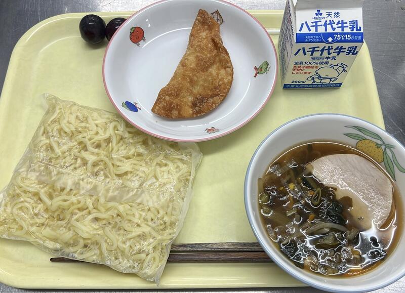 ポニョのハムいりラーメン さつまいものパリパリあげ ぶどう 牛乳 |