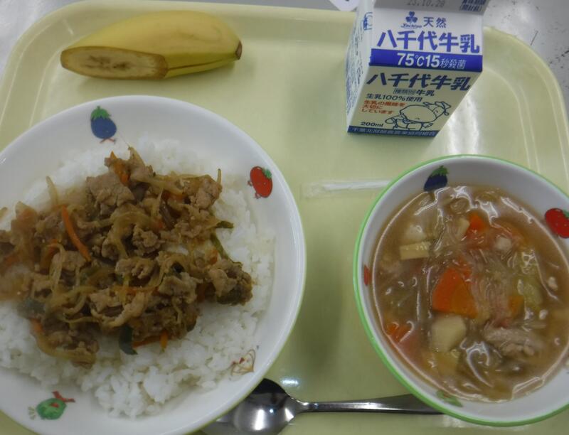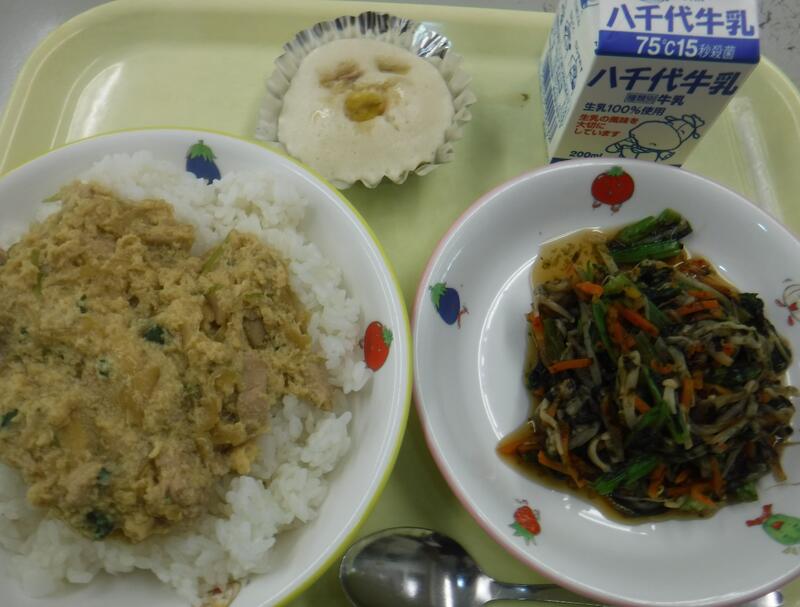 | コメント | 今日は豚肉が入ったどんぶりです。「どんぶり」は江戸時代に生まれた料理で、忙しい職人さんたちが簡単に早く食べられるように工夫して作られるようになりました。また、デザートは「ふたりはいっしょ」の絵本に出てくるチョコチップクッキーです。これは仲良しのがまくんとかえるくんのお話で、がまくんがクッキーを作ってくれたのですがおいしくて食べ過ぎてしまいます。そこでクッキーを我慢するためにいろんな工夫をするお話です。とても楽しい絵本ですのでぜひ読んでみてください。 |