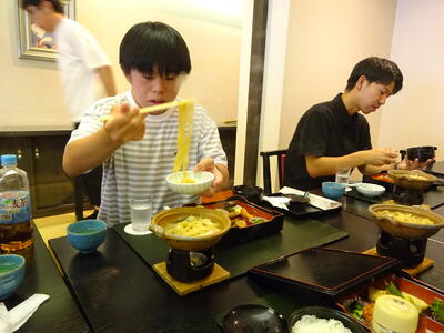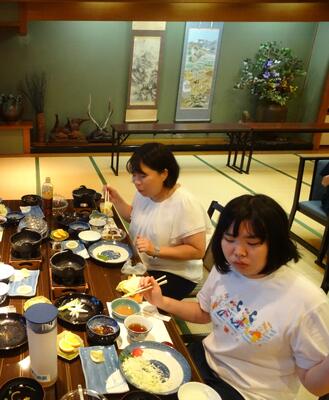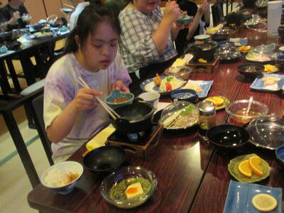 午前中は、和菓子作りとお抹茶体験を行い、昼食は自分たちでお好み焼きと焼きそばを焼いて食べました。
