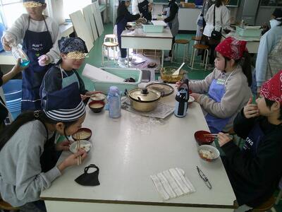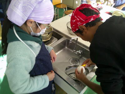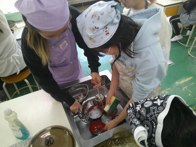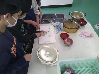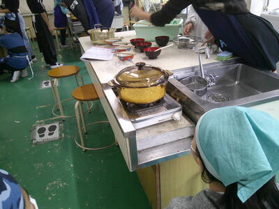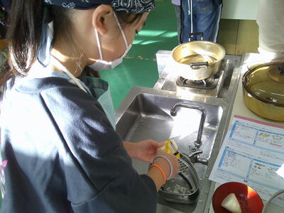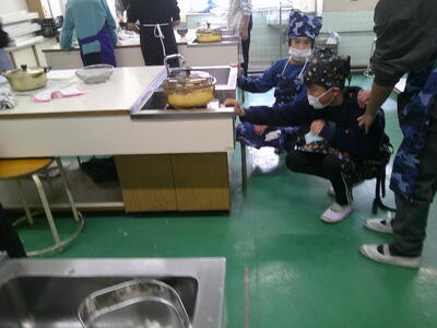 一人一人に役割分担があり、その仕事を責任をもって行っています。少し自信がないところもあるようですが、ノートや教科書を確認しながらみそ汁、ごはん炊きを行っていました。