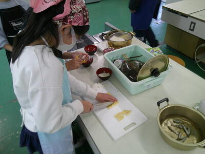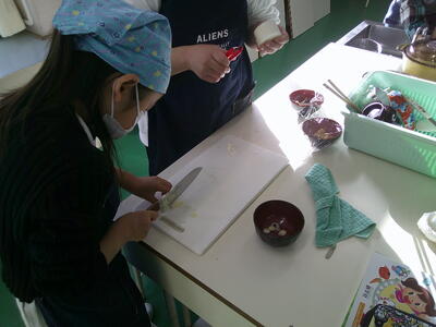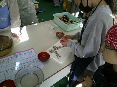 みそ汁に入れる野菜の切り方、にぼしょの処理の仕方、皮のむき方など、事前に学習したことを実践しています。