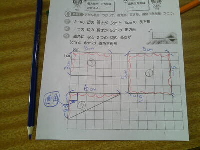 学習のめあてが、「方眼用紙を使って、長方形、直角三角形、正方形を描こう」です。