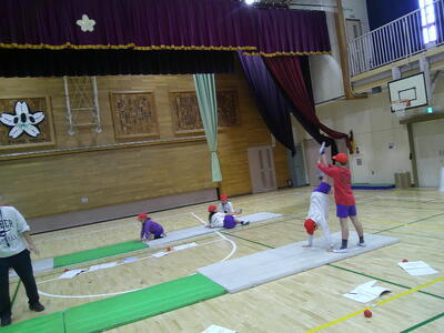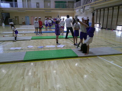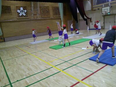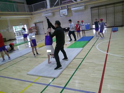次に、倒立技を加えた4つの技をつなげた運動です。一人一人の練習をグループの仲間が見て、助言をしたり、拍手を送ったりしました。
