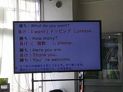 二人組でトッピングの野菜を購入する設定で活動します。どの野菜がいくつ必要なのか、英語で会話をします。