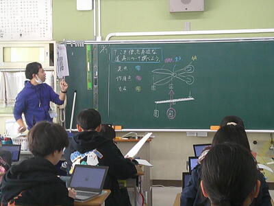 てこのはたらきの学習でした。ハサミを使って、支点・力点・作用点を確認していました。