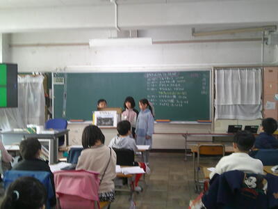 町たんけんで学んできたことを各グループで発表します。今日は、お家の方も参観に来てくださっています。子供たちは緊張しながらも、堂々と伝えることができました。