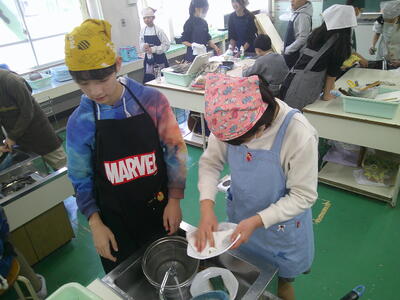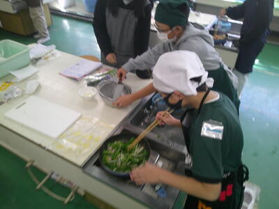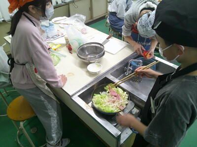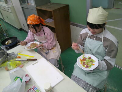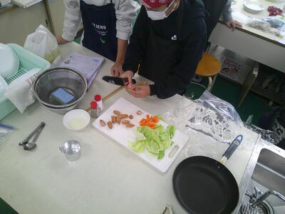 調理実習を行ていました。「いためて おかずをつくろう」ということで、一人一人、自分たちで1食分の野菜やウインナーなど、考えた材料を持参し、野菜炒めを作りました。