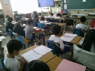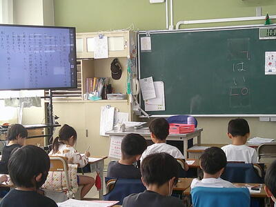 朝学習「稲書きタイム」の時間です。1年生の教室を覗いてみました。「 」かぎかっこを正しくつける、プリント学習に取り組んでいました