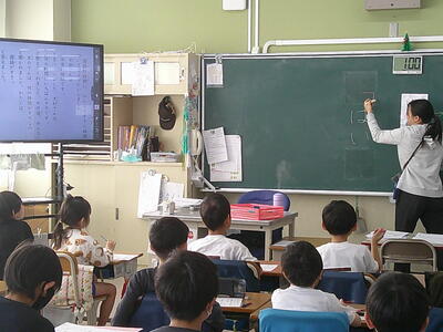 町たんけんで学んできたことを各グループで発表します。今日は、お家の方も参観に来てくださっています。子供たちは緊張しながらも、堂々と伝えることができました。