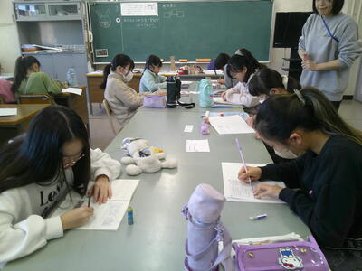 講師 國吉敬子先生とお教室の先生方5名がお越しいただき、ご指導いただきました。3年生にとっては、書初めの経験が初めての児童もいます。