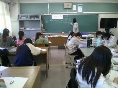調理実習の時間です。ご飯とみそ汁を作ります。最初に調理にあたり、説明を行っています。