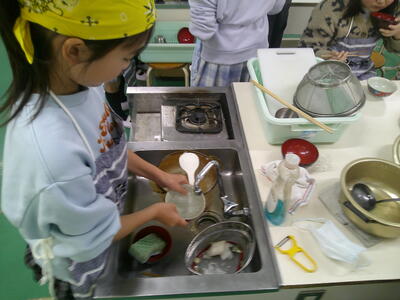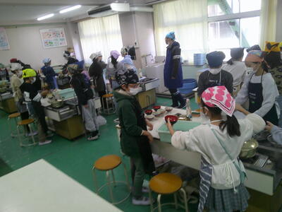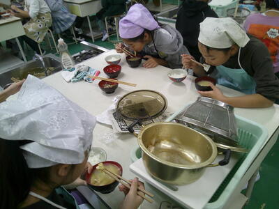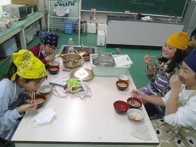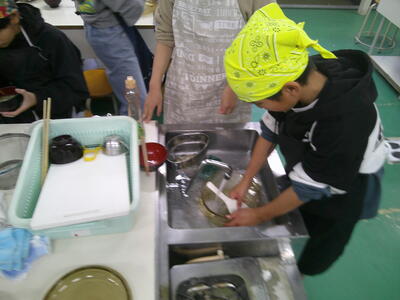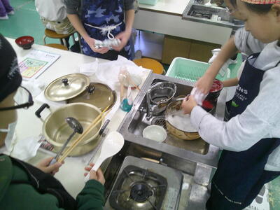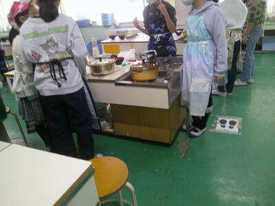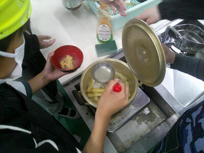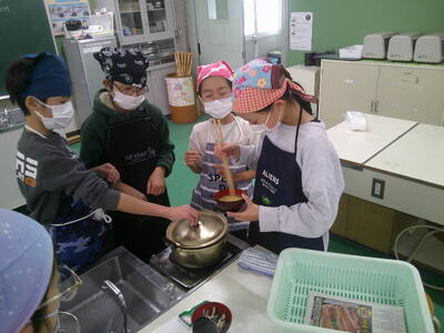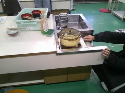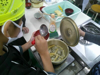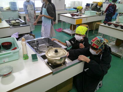 一人一人に役割分担があり、その仕事を責任をもって行っています。少し自信がないところもあるようですが、ノートや教科書を確認しながらみそ汁、ごはん炊きを行っていました。