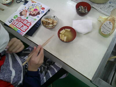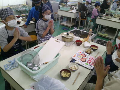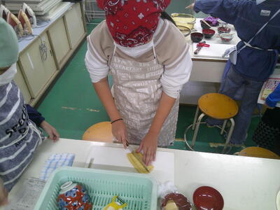 みそ汁に入れる野菜の切り方、にぼしょの処理の仕方、皮のむき方など、事前に学習したことを実践しています。