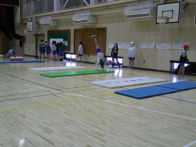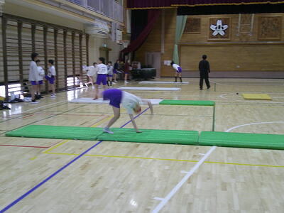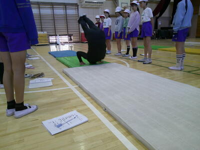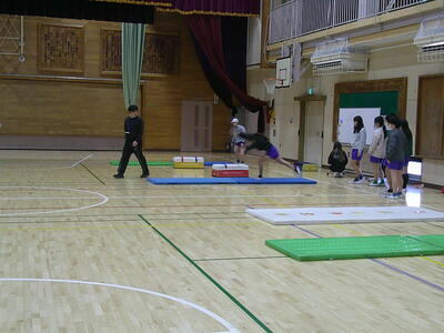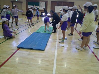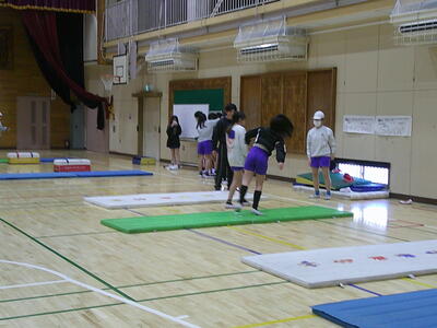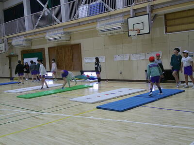 マット運動の学習です。三つの技をつなげる組み合わせ技を作る活動です。