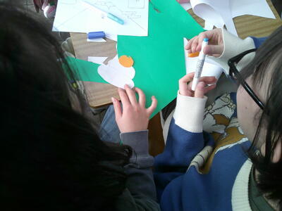 形と方向を使って、顔づくりができる活動では子供たちが盛り上がり、外国語に慣れ親しんでいました。