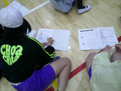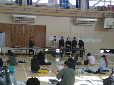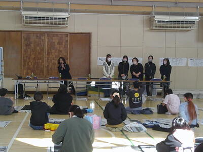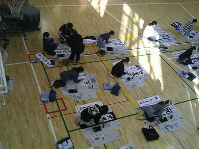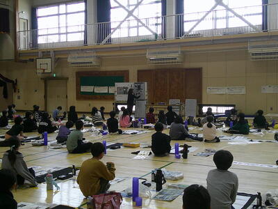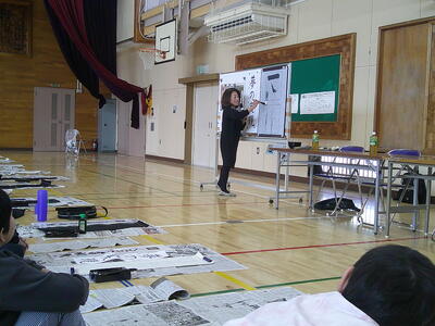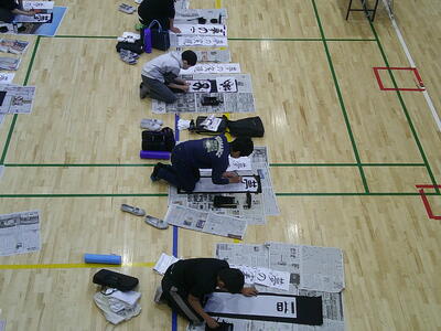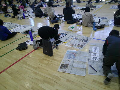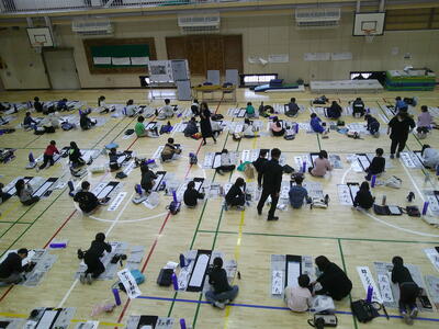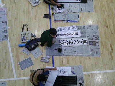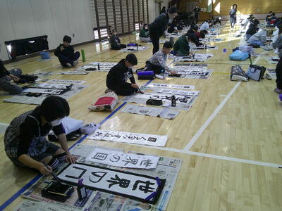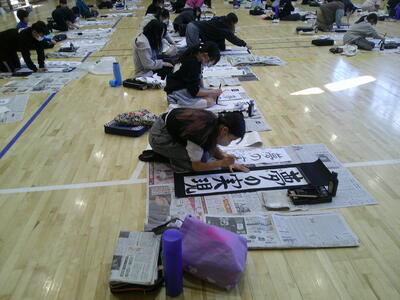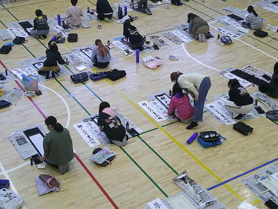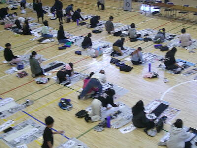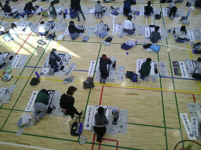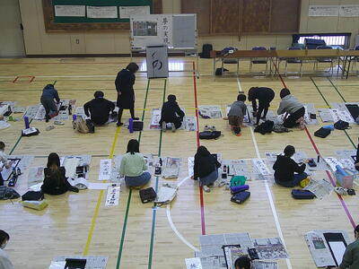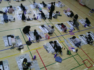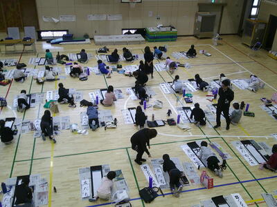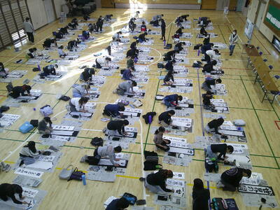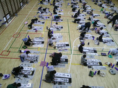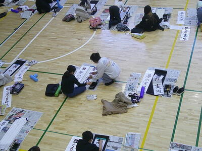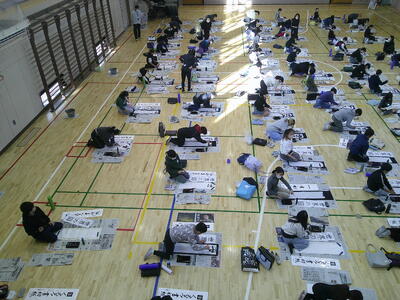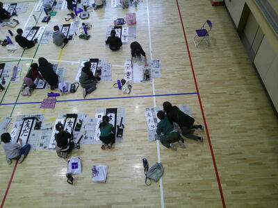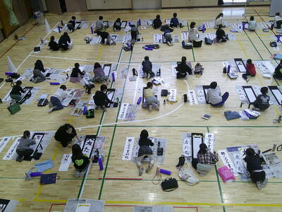 今年度、國吉龍華書道教室の國吉敬子先生をはじめとする、他先生方が5名お越しいただき、書初めの練習を体育館で行いました。