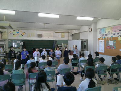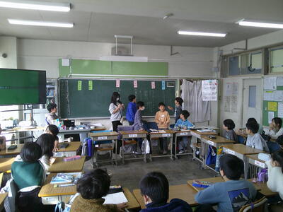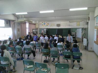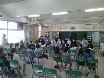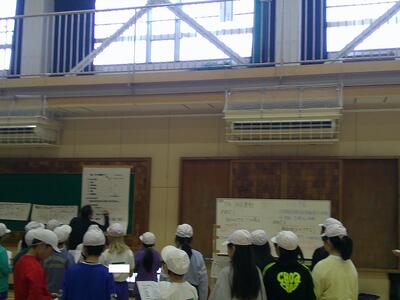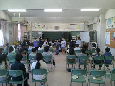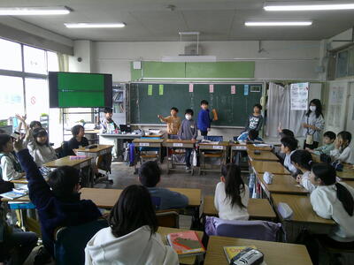 各クラスの代表者が出て、学年問わず集まって代表者の発表を聞いていました。図書委員の児童が進行を進めてくれました。