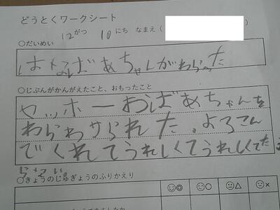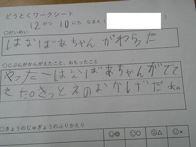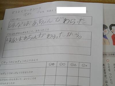 「はなばあちゃんが わらった」の教材を使って、優しさについて考えました。