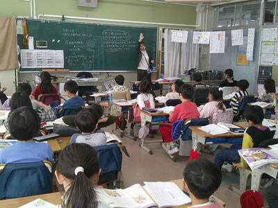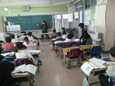 概数の学習は、毎年、苦手とする児童が多くいます。4年生は少人数指導の先生も含めて、4つのグループに分かれて取り組んでいます。どのグループも、どこで切り上げて、どこで切る捨てるのか、四捨五入の問題や上から何桁までの概数とは等、繰り返し取り組んでいました。
