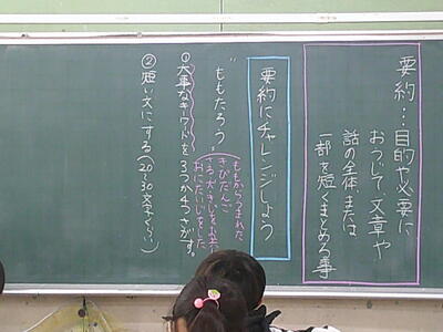 教材の内容に迫る前に、子供たちがよく知っている「ももたろう」の話で要約にチャレンジしてました。