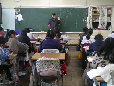 講師 國吉敬子先生とお教室の先生方5名がお越しいただき、ご指導いただきました。3年生にとっては、書初めの経験が初めての児童もいます。