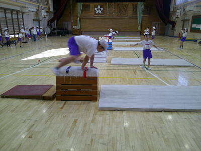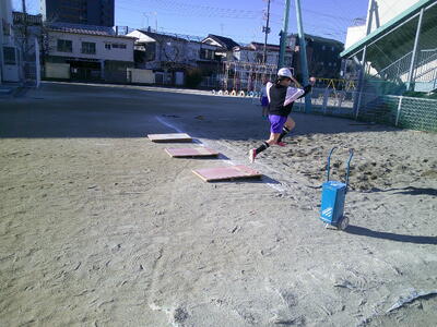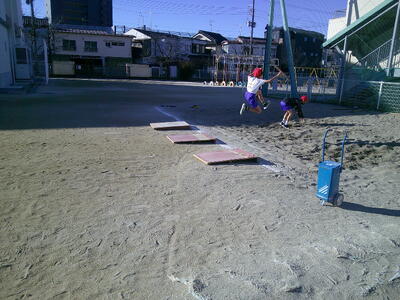 走り幅跳びは、記録の距離が伸びていくことが楽しい運動です。距離を伸ばすための運動のポイントは、「リズミカルな助走」「力強い踏み切り」「両足着地」の3つです。