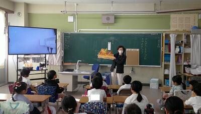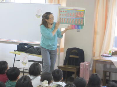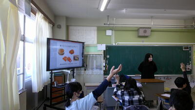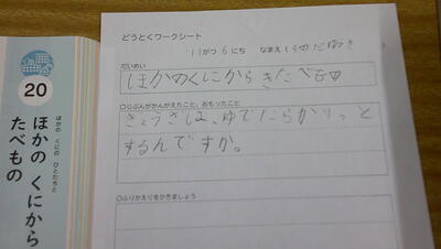 「ほかのくにからきたたべのもの」を副教材に、いろいろな国の食べ物を掲示しました。そして、子供たちは日ごろ食べているものの中で何が好きか質問されると、元気に手を挙げて発表していました。