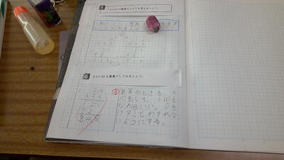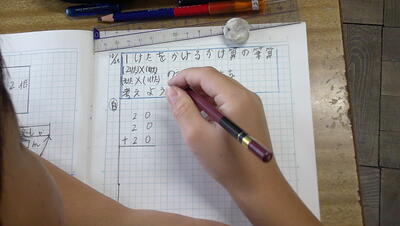 少人数指導の時間です。「一の位があがる筆算の仕方を考えよう」が本時のめあてです。