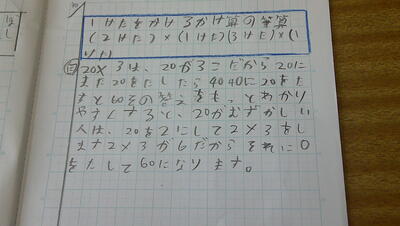 既習のかけ算九九が使えるようにし、位ごとに分けて計算した数をたしていく分配法則を用いて計算するという考え方を理解するところです。