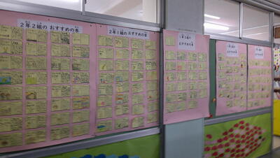 廊下には、クラスごとに一人一人のおすすめの本の紹介カードが掲示してあります。