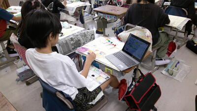 風景画に取り組んでいます。学校内で一人一人が選んだ場所をタブレットで写真を撮り、その画像で風景画を描いています。遠近法の技法を学びながら、絵の具では濃淡を使い分けて立体的に仕上げています。