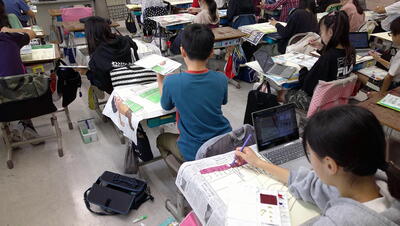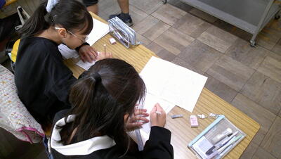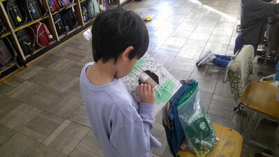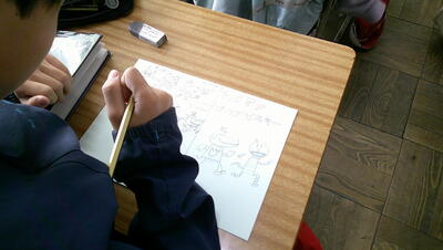 校外学習の様子を振り返り、まとめとして新聞づくりを行っています。どの子も、集中して伝えたい内容をまとめていました。新聞づくりは決められた枠内に、伝えたい内容を吟味しながら表現するので書く力がつきます。相手意識、目的意識をしっかり押さえて取り組んでいます。