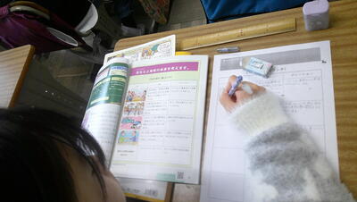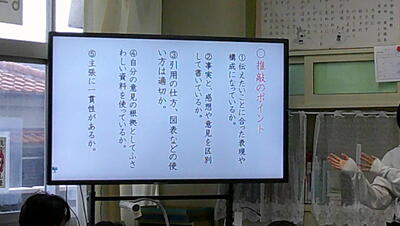 担任の先生から、意見文を完成するにあたり、ポイントが伝えられました。①段落をつけること ②始めと終わりが同じ意見になっていること、特に終わりは、もう一度自分の立場を入れて説得力のある書きぶりが大切です ③資料を載せて、事実と意見を区別して書くこと 以上を踏まえて意見文完成に取り組んでいました。