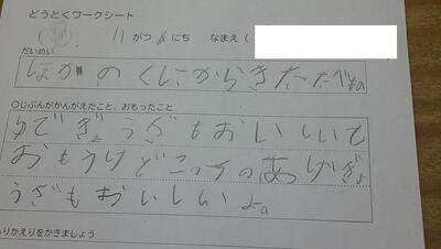 いろいろな国の食べの物の写真にいるお友達に、どんなことを話したいか?ワークシートに書きました。
